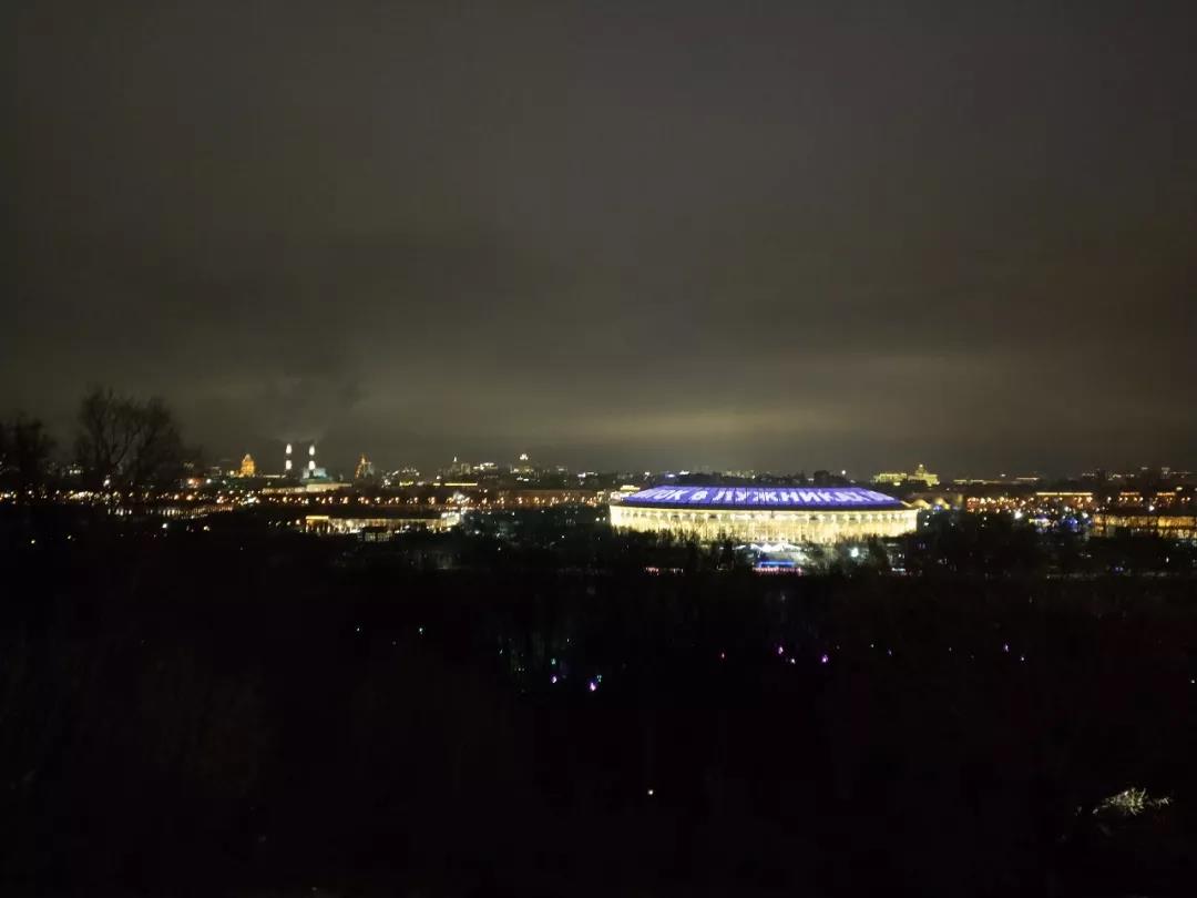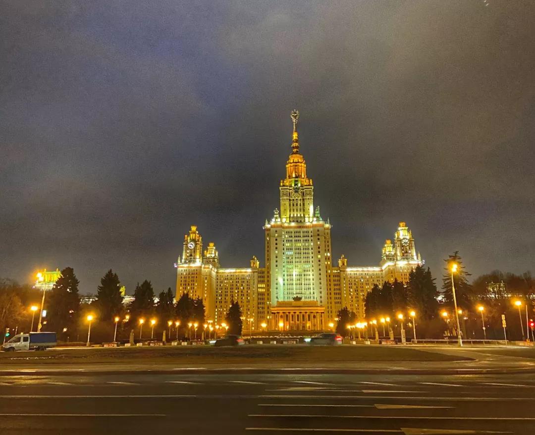 麻雀山頂極目遠(yuǎn)眺,望不盡繁華與典雅,巍巍白樺,裊裊浮云,熠熠燈火,在現(xiàn)代與古典中演繹著莫斯科的前世今生,有歷史的厚重感,有蒼生的寫實(shí)感,都在闌珊之際拓印出它應(yīng)有的輪廓。莫斯科國(guó)立大學(xué)莊嚴(yán)肅穆地聳立著,作為莫斯科七座斯大林式建筑之一,其大底座高尖頂?shù)奶厣滞庑涯?,在夜幕和燈光的輝映下?lián)纹鹆藲鈩?shì),展現(xiàn)出最高學(xué)府的極度自信。