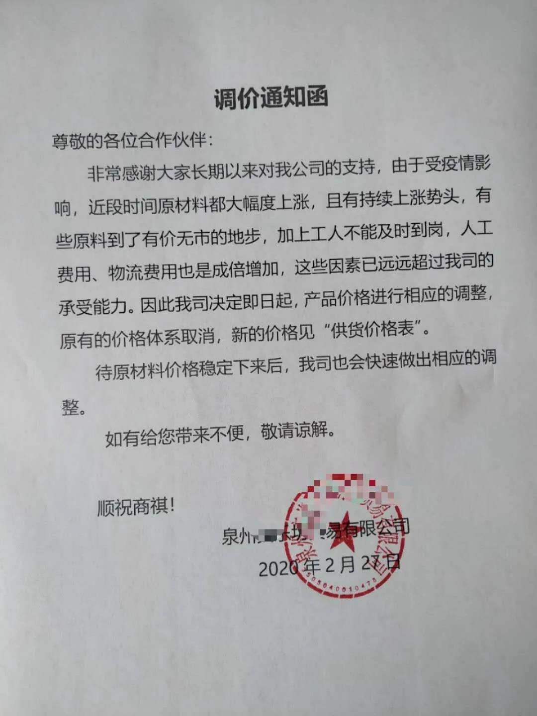 “3月1日起,旗下所有產(chǎn)品上調(diào)5%”,“產(chǎn)品價(jià)格進(jìn)行相應(yīng)調(diào)整,原有的價(jià)格體系取消”。所有產(chǎn)品單價(jià)上漲5%,超出正常運(yùn)費(fèi)部分由客戶承擔(dān),持續(xù)到疫情得到控制,原材料下降”