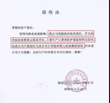 “受政委委托,作為此次疫情重點(diǎn)聯(lián)系單位,主要生產(chǎn)口罩和防護(hù)服原材料無紡布,不能按時(shí)正常提供嬰兒紙尿褲原材料”