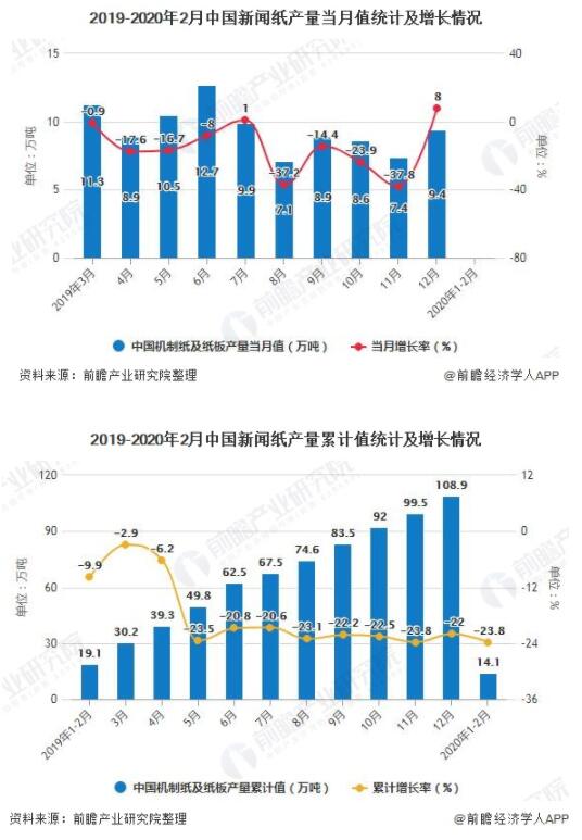2020年1-2月中國新聞紙產(chǎn)量超14萬噸