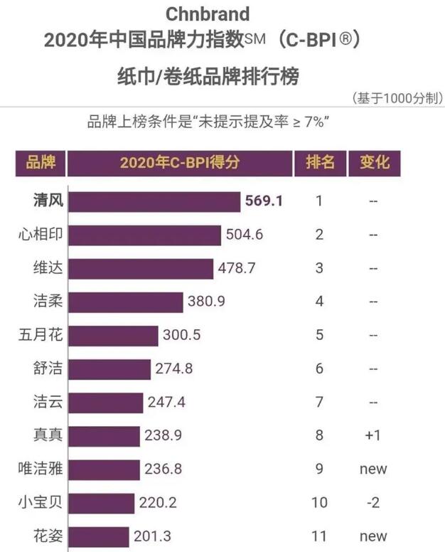 清風能夠連續(xù)兩年榮獲“2020年C-BPI中國品牌榜紙巾/卷紙類第一品牌*”,同公司品牌真真和唯潔雅也成功躋身前十,這不僅證明產品品質得到認可,更意味著品牌獲得廣大消費者的喜愛與支持。