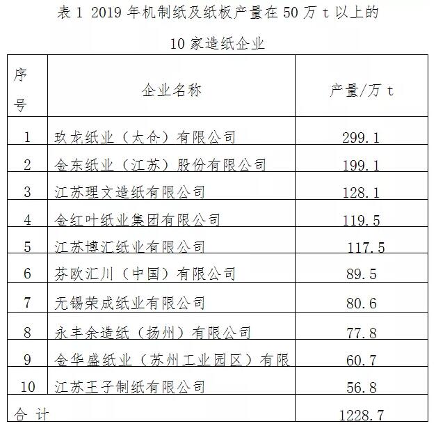 2019年江蘇省機(jī)制紙及紙板年產(chǎn)200萬(wàn)t以上的企業(yè)有1家;年產(chǎn)100萬(wàn)~200萬(wàn)t的企業(yè)有4家;年產(chǎn)50萬(wàn)~100萬(wàn)t的企業(yè)有5家;年產(chǎn)10萬(wàn)~50萬(wàn)t的企業(yè)有10家。