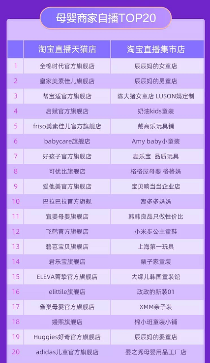 在母嬰領(lǐng)域,各品牌也在大力布局直播,據(jù)淘寶公開數(shù)據(jù),6月1日~6月18日母嬰商家自播TOP榜,幫寶適、babycare、好孩子、可優(yōu)比、愛他美、巴拉巴拉、好奇、Adidas等品牌的天貓官方旗艦店紛紛登榜。上榜母嬰親子TOP榜的品牌,在直播上也同樣表現(xiàn)優(yōu)秀。此次618大戰(zhàn)中,直播功不可沒,已經(jīng)成為商家業(yè)績(jī)?cè)鲩L(zhǎng)一大新動(dòng)力。