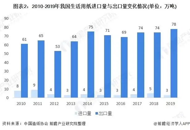 2010-2019年,我國生活用紙進口數(shù)量較少,出口數(shù)量整體上呈現(xiàn)波動增長態(tài)勢,出口量遠高于進口量。2019年,我國生活用紙進口量為3萬噸,較2018年減少了2萬噸;出口量實現(xiàn)78萬噸,較2018年增長了4萬噸。