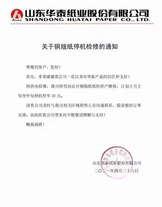 華泰紙業(yè):因熱點(diǎn)檢修,我司研究決定對銅版紙紙機(jī)停產(chǎn)維保,計劃5月上旬至中旬擇機(jī)停車10天。