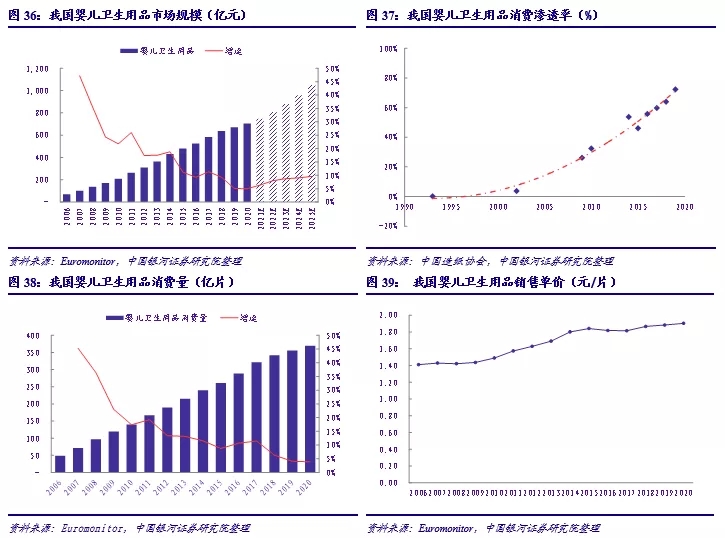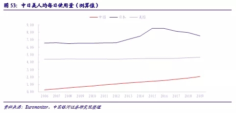 3.人均使用量的提升。伴隨著衛(wèi)生意識(shí)的提高,消費(fèi)升級(jí)趨勢(shì)以及嬰兒衛(wèi)生用品新產(chǎn)品的更新?lián)Q代,家長們會(huì)更加注重紙尿褲安全性與舒適感,不斷提高使用更換頻次。根據(jù)測(cè)算,日本市場(chǎng)出現(xiàn)波動(dòng)前每個(gè)適齡嬰幼兒(0-3歲)的每日使用量約為6.5片,美國市場(chǎng)的長期均值水平為4.5片/日;對(duì)比之下,盡管出現(xiàn)提升趨勢(shì),我國當(dāng)前的人均使用量為2片/日,較發(fā)達(dá)成熟市場(chǎng)存在較大差距,未來有望進(jìn)一步提升至4-6片/日的區(qū)間內(nèi)。