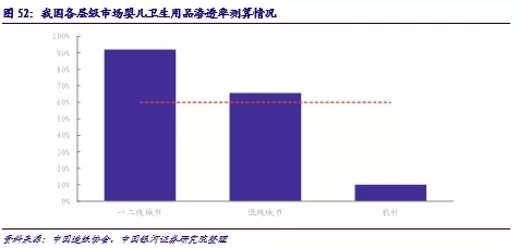 2.三四線城市以及農(nóng)村市場(chǎng)滲透率的提升。根據(jù)現(xiàn)有數(shù)據(jù)測(cè)算,各地的嬰兒衛(wèi)生用品滲透率存在明顯差異,三四線等中低消費(fèi)等級(jí)城市與農(nóng)村地區(qū)嬰兒紙尿褲的滲透率仍然有待提升,由此可以帶來整體消費(fèi)量的提升空間。