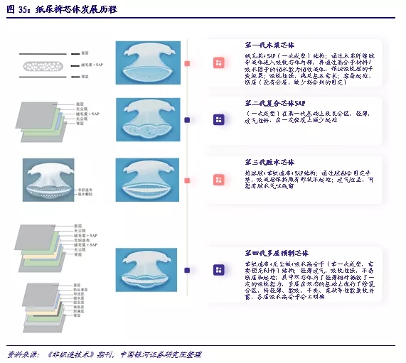 自香港的瑞德國際旗下品牌Fitti菲比(1992年),以及金佰利旗下品牌好奇(1994年)進(jìn)入中國大陸市場(chǎng),我國嬰兒衛(wèi)生用品行業(yè)經(jīng)歷了快速發(fā)展,產(chǎn)品在材質(zhì)、結(jié)構(gòu)等層面不斷迭代更新。行業(yè)整體與其核心——芯體的發(fā)展歷程相近,以2006年為階段性節(jié)點(diǎn),在此之前,我國的嬰兒衛(wèi)生用品行業(yè)以外資品牌為主,好奇、幫寶適、媽咪寶貝等國際品牌集中進(jìn)入中國市場(chǎng),產(chǎn)品芯體雖有結(jié)構(gòu)分區(qū)的變化,但以絨毛漿和SAP材質(zhì)為主導(dǎo);2006年不含絨毛漿的復(fù)合芯體結(jié)構(gòu)出現(xiàn),此后國內(nèi)品牌大舉擴(kuò)張,市場(chǎng)內(nèi)多品牌混戰(zhàn)。