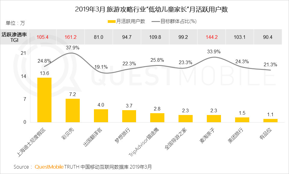 在親子旅游方面,隨著親子節(jié)目的熱播,讓近兩年親子游市場持續(xù)火爆。在旅游攻略APP中,彩貝殼目標(biāo)群體占比37.9%,其次為麥淘親子33.9%,而麥淘親子、上海迪士尼、彩貝殼等親子游類的旅游攻略受到低幼家長的青睞。從中可以看到隨著對教育要求的全面升級,孩子的眼界和經(jīng)歷、親子陪伴也成為了父母關(guān)注的一大重點(diǎn)。