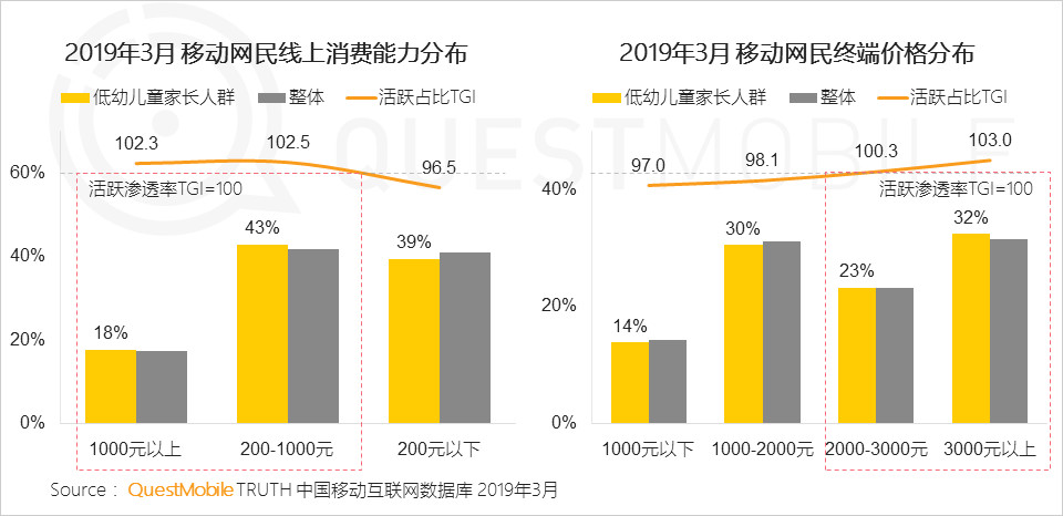 2019年3月移動(dòng)網(wǎng)民線上消費(fèi)能力數(shù)據(jù)顯示,200-1000元線上消費(fèi)占比43%,1000元以上18%,200元以下39%。但網(wǎng)民終端價(jià)格3000元以上占32%,2000-3000元占23%。從中可以看到“低幼兒童家長”人群線上消費(fèi)能力顯著高于整體網(wǎng)民,且使用高價(jià)格終端的比例較高,未來兒童消費(fèi)將成為經(jīng)濟(jì)市場一大增長點(diǎn)。