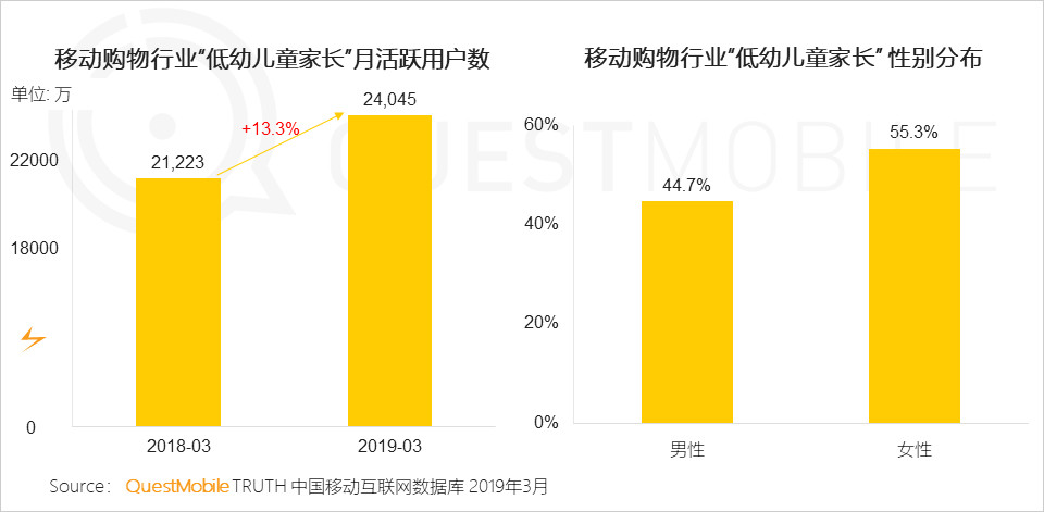 在線消費(fèi)領(lǐng)域,2019年3月網(wǎng)購的“低幼兒童家長”人群同比增長13.3%;其中移動(dòng)購物行業(yè)”低幼兒童家長“性別分布上來看,男性占44.7%,女性占到55.3%??梢姷?ldquo;寶媽”者得市場,女性的占比顯著高于男性。