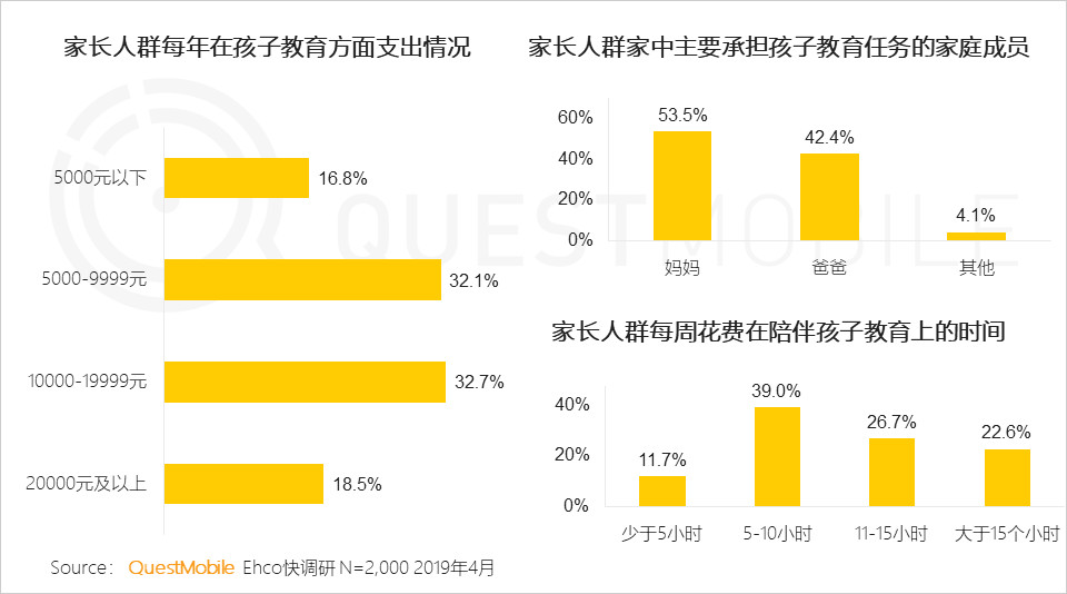 而在家庭人群每年在孩子教育方面支出情況,超八成的家長每年在孩子的教育方面支出均在5000元以上,其中10000-19999元占32.7%,5000-9999元占32.1%??梢娙藗儗τ诤⒆拥慕逃砷L真是寄予厚望。而在家長人群中媽媽作為主要承擔(dān)孩子教育任務(wù)占53.5%。從中可以看到在孩子的教育問題上,“媽媽”才是教育決策的主要決策者。而在家長人群每周花費(fèi)在陪伴孩子教育上的時(shí)間5-10小時(shí)占比最高,達(dá)到39%。