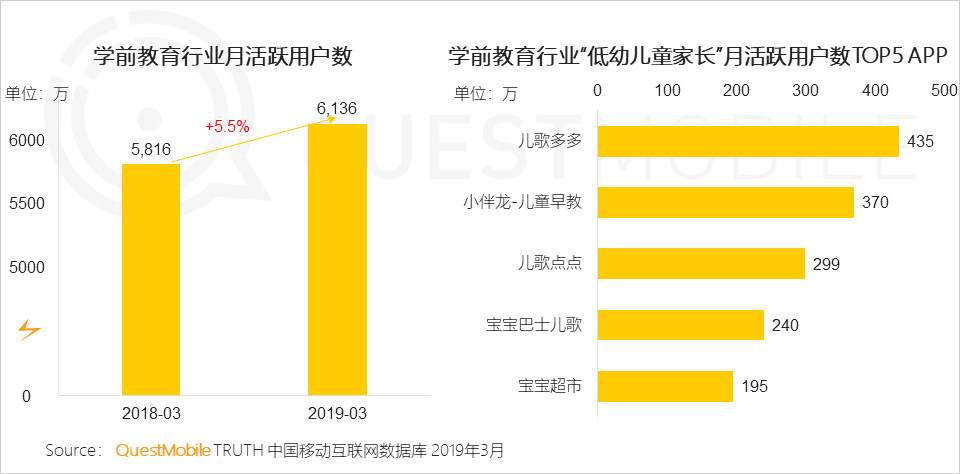 最新數(shù)據(jù)顯示,學(xué)前教育用戶增速明顯高于整體移動(dòng)網(wǎng)民增長速度,而在線早教憑借技術(shù)的快速發(fā)展深得家長喜愛,在學(xué)前教育行業(yè)”低幼兒童家長“月活躍用戶數(shù)TOP5APP排列依次分別是兒歌多多、小伴龍-兒童早教、兒歌點(diǎn)點(diǎn)、寶寶巴士兒歌、寶寶超市。其中早教APP兒歌多多以435萬排列第一,其次為小伴龍-兒童早教月活躍用戶達(dá)370萬。