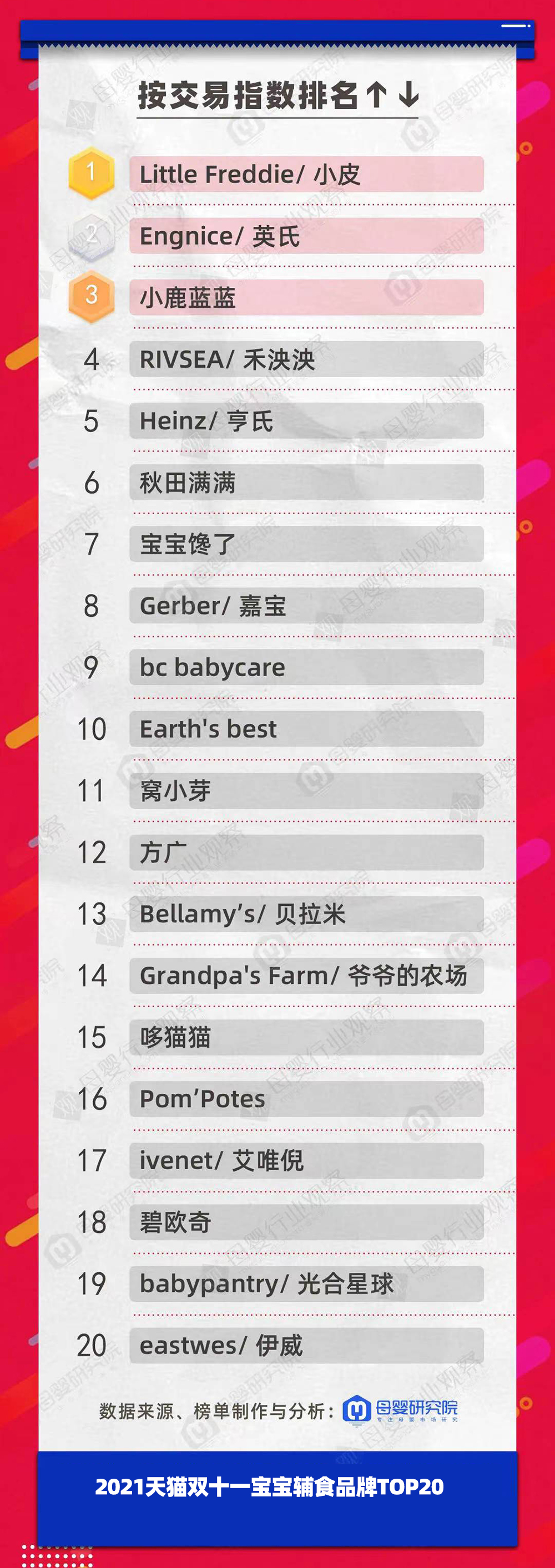 在寶寶輔食品牌交易指數(shù)前三的是Little Freddie小皮、Engnice英氏以及小鹿藍(lán)藍(lán)。而去年前三的是Gerber嘉寶、Little Freddie小皮和寶寶饞了,英氏排名第四。