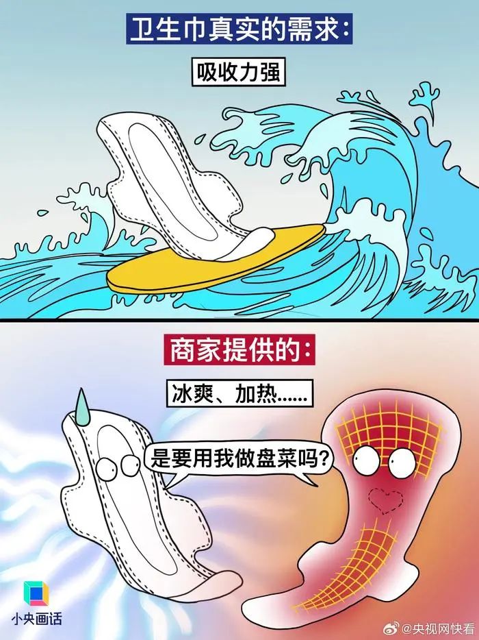 【#別拿消費(fèi)主義那套來(lái)做衛(wèi)生巾#】想不通,衛(wèi)生巾這種每個(gè)月都要用的東西,怎么會(huì)做得又貴又難用。商家以為我需要:加冰、加熱、加玻尿酸、粉嫩包裝、明星代言……實(shí)際我需要的:干凈衛(wèi)生、護(hù)翼好貼、安全不漏、價(jià)格適中。衛(wèi)生巾是日用品,別搞消費(fèi)主義輕奢那一套。(繪圖.阿彬的漫畫生活)#有種女性貧困叫月經(jīng)貧困#