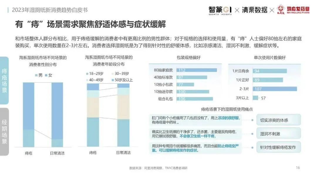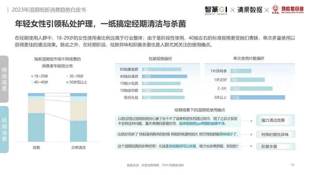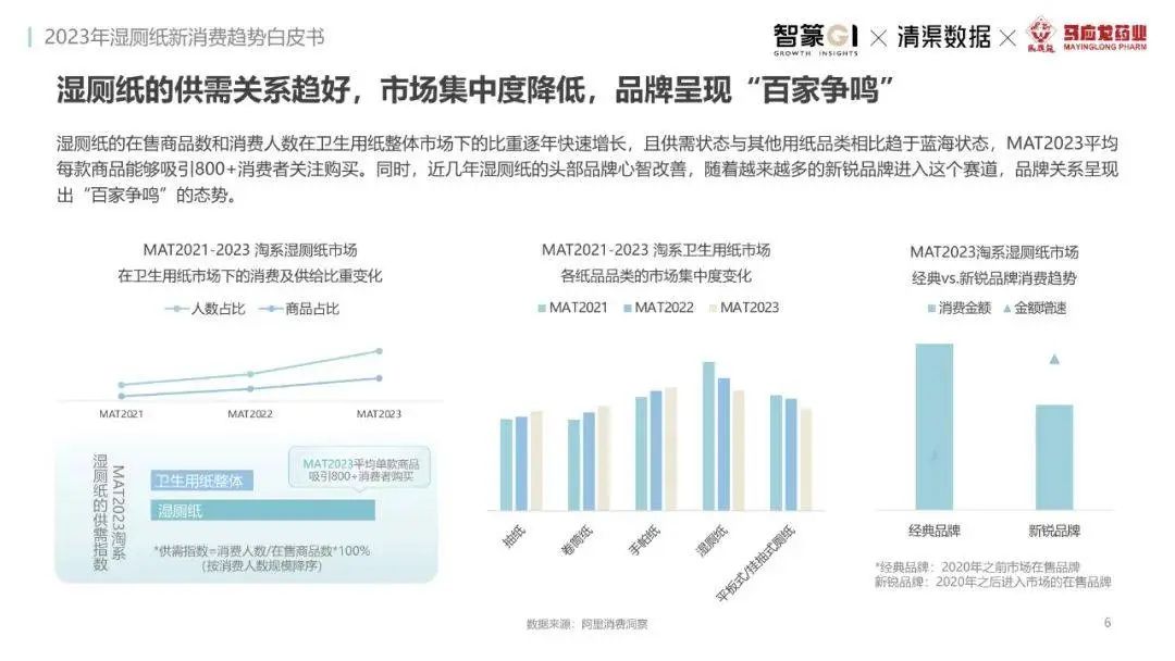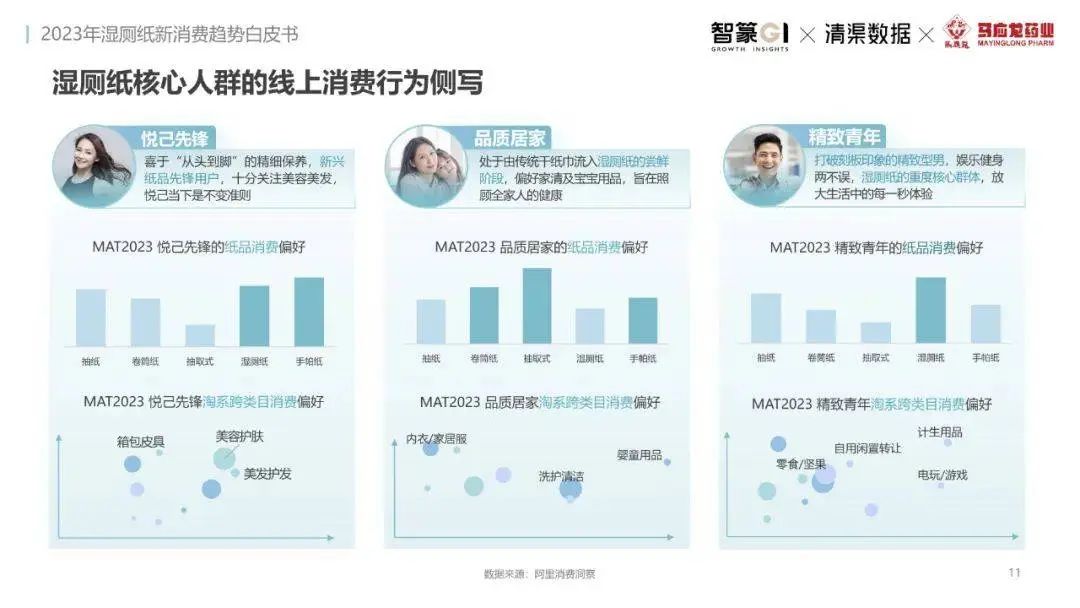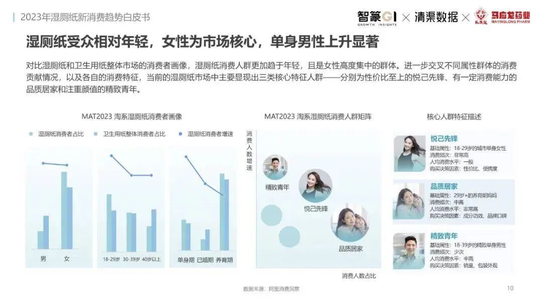 淘系濕廁紙品類近三年的消費(fèi)金額持續(xù)增長,增幅遠(yuǎn)超衛(wèi)生用紙整體市場,其中,天貓官旗的消費(fèi)責(zé)獻(xiàn)占主陣地,MAT2023占淘系年度消費(fèi)的六成以上,市場規(guī)模的擴(kuò)張主要來自消費(fèi)人數(shù)的增長,有越來越多的新客涌入,共同推動溫廁紙的全民風(fēng)潮,同時(shí),消費(fèi)者的使用習(xí)慣養(yǎng)成,復(fù)購意愿顯現(xiàn),消費(fèi)頻次也達(dá)到衛(wèi)生用紙整體的增速。