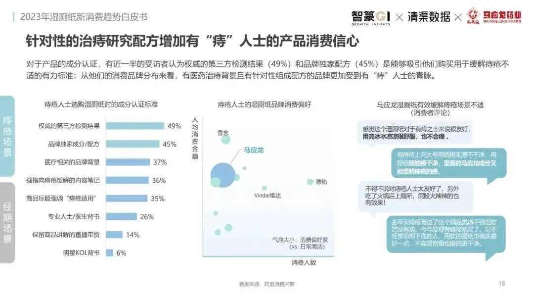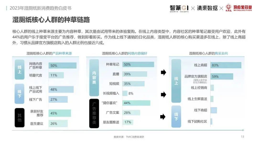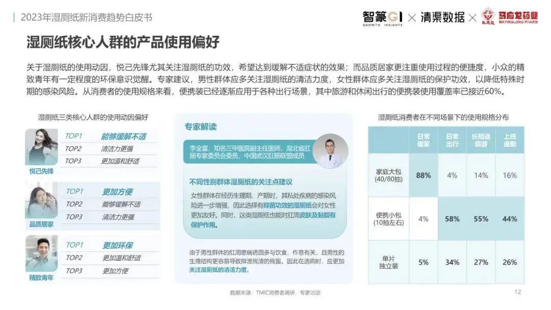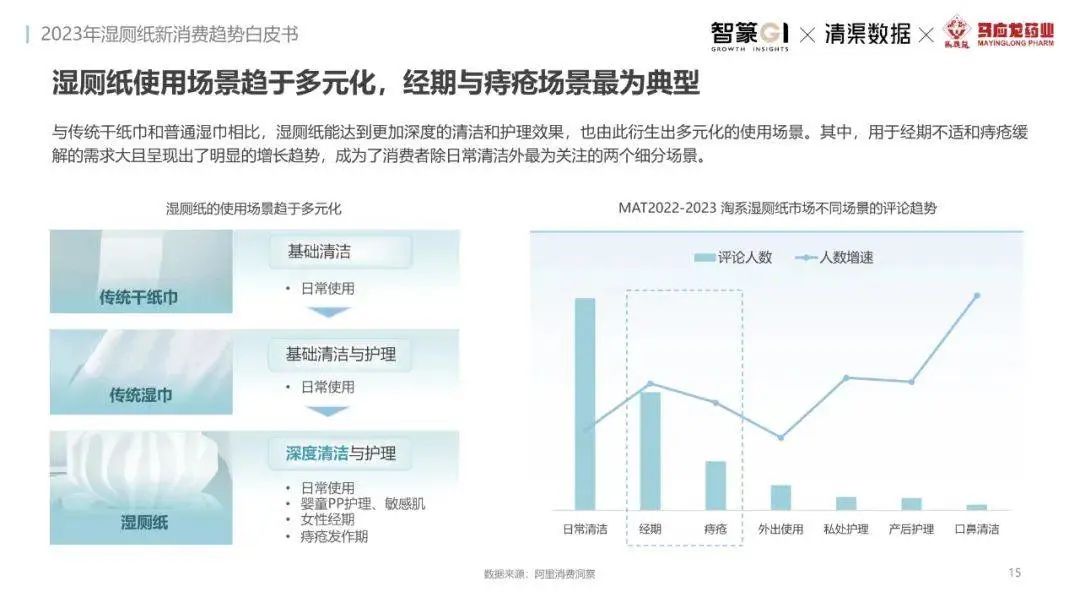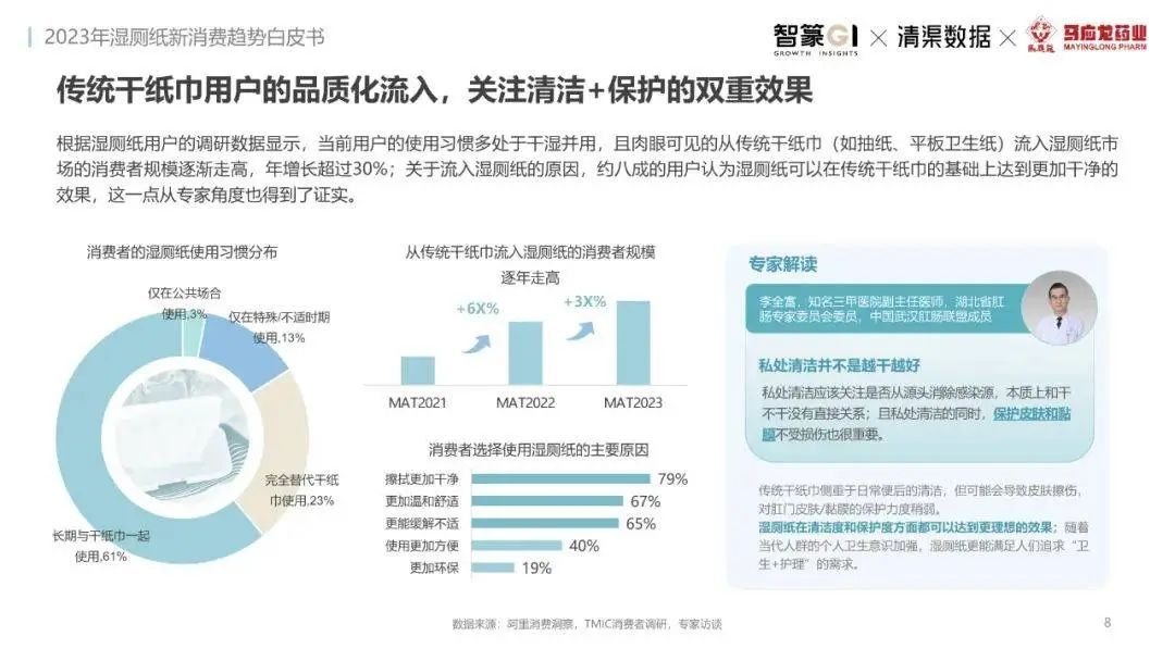 淘系濕廁紙品類近三年的消費(fèi)金額持續(xù)增長,增幅遠(yuǎn)超衛(wèi)生用紙整體市場,其中,天貓官旗的消費(fèi)責(zé)獻(xiàn)占主陣地,MAT2023占淘系年度消費(fèi)的六成以上,市場規(guī)模的擴(kuò)張主要來自消費(fèi)人數(shù)的增長,有越來越多的新客涌入,共同推動溫廁紙的全民風(fēng)潮,同時(shí),消費(fèi)者的使用習(xí)慣養(yǎng)成,復(fù)購意愿顯現(xiàn),消費(fèi)頻次也達(dá)到衛(wèi)生用紙整體的增速。